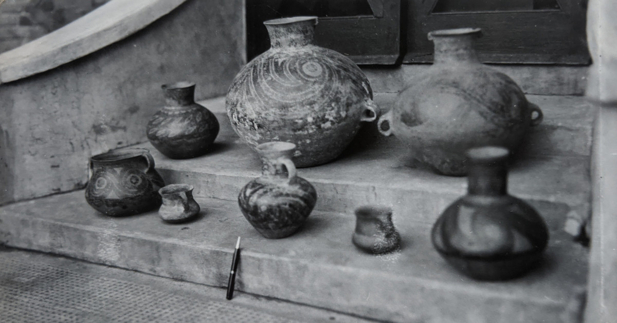 ‘Het had niet veel gescheeld of de potten waren er niet meer geweest. Frans Bourdrez nam zoals gezegd de potten mee in het vliegtuig terug naar de toenmalige hoofdstad Nanjing, waar hij woonde, ten koste van zijn baggage. Frans was geen ervaren kunstverzamelaar. Hij kocht wat hij mooi vond, veelal kommetjes en kleine beeldjes, zoals een Tang-paard. Hij zette die voorwerpen achteloos op de kast of op de koffietafel. Frans wist echter dat de prehistorische potten bijzonder waren. Hij nam wel een foto van alle potten op de trap voor zijn huis, zoals te zien in het artikel. Maar daarna pakte hij ze weer voorzichtig in in enkele kisten. Zo stonden ze ruim een jaar onaangeraakt, opgeslagen in zijn huis in Nanjing. Toen werd het oorlog.