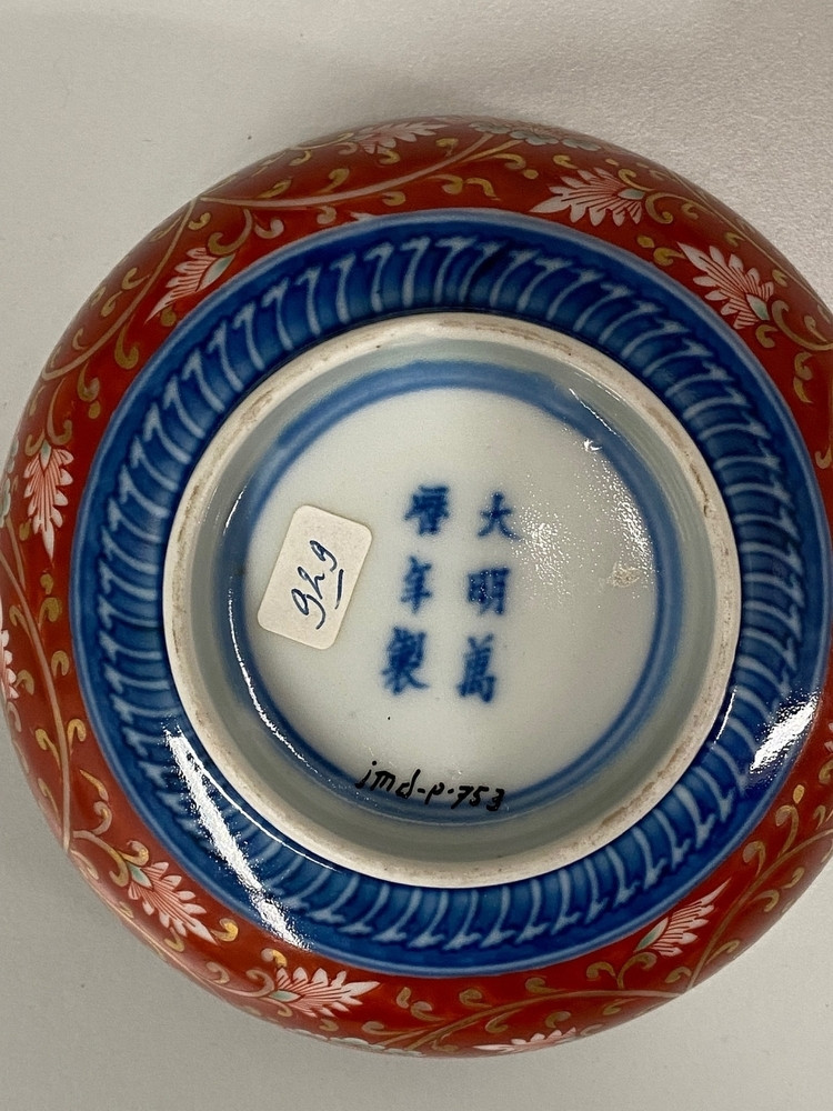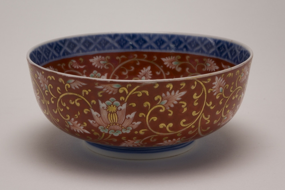 Kom op standring met op de buitenzijde goudkleurige en groene bloemdecoraties op een roodbruine ondergrond. Aan de standring rondom blauwe onderglazuurdecoratie. Op de binnenzijde idem met blauwe decotatie een de bovenrand.
