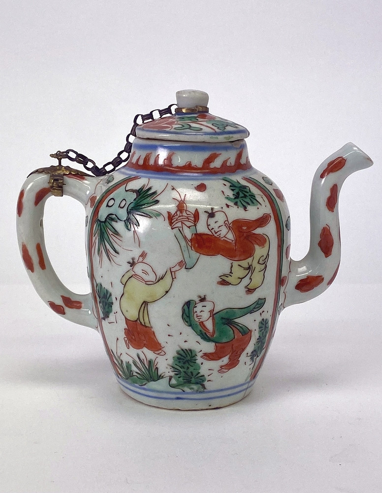 Tall teapot on footring, wide mouthrim, low conical lid with knob. Long, S-shaped spout, C-shaped handle. Decorated in iron-red, two shades of green, yellow and black enamel on the glaze. Around the foot, on the shoulder, around the mouth and on the lid circles in underglaze blue. On the body two large panels. In one a Chinese figure riding a kylin, in the other three dancing boys. A flower scroll on the lid. A partly silver gilt mount was fitted later in Europe. The boy on the kylin and the dancing boys symbolise countless generations of sons. As a new item, transitional porcelain in enamel colours had the potential to be extremely successful in The Netherlands, but production was halted by Chinese civil wars before it became established in Europe. Most enamelled porcelain of this period was intended for south-east Asia or, as ko-akae, for Japan. Tea drinking, and thus teapots, was normal in Asia, but still had to become popular in The Netherlands. An almost identical example is in the Groninger Museum, Groningen (unpublished).