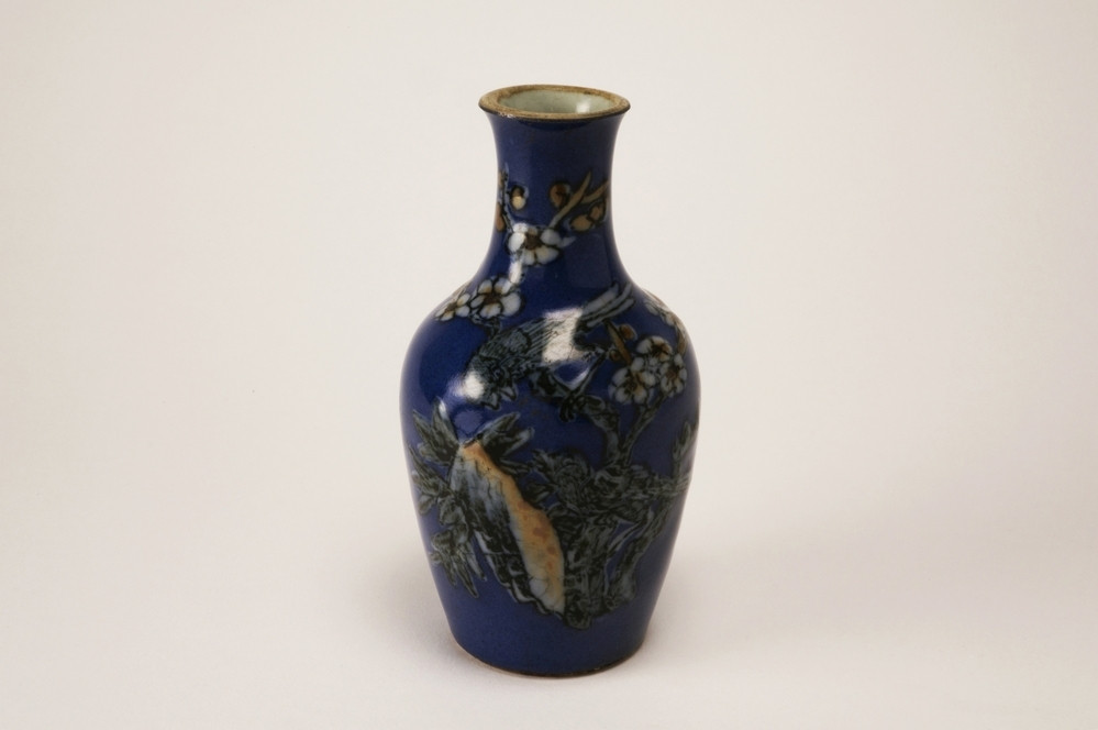 Flets blauw vaasje met hierop een tak met bloemen en vogels in vlakreliëf gekleurd met zwart en bruin.