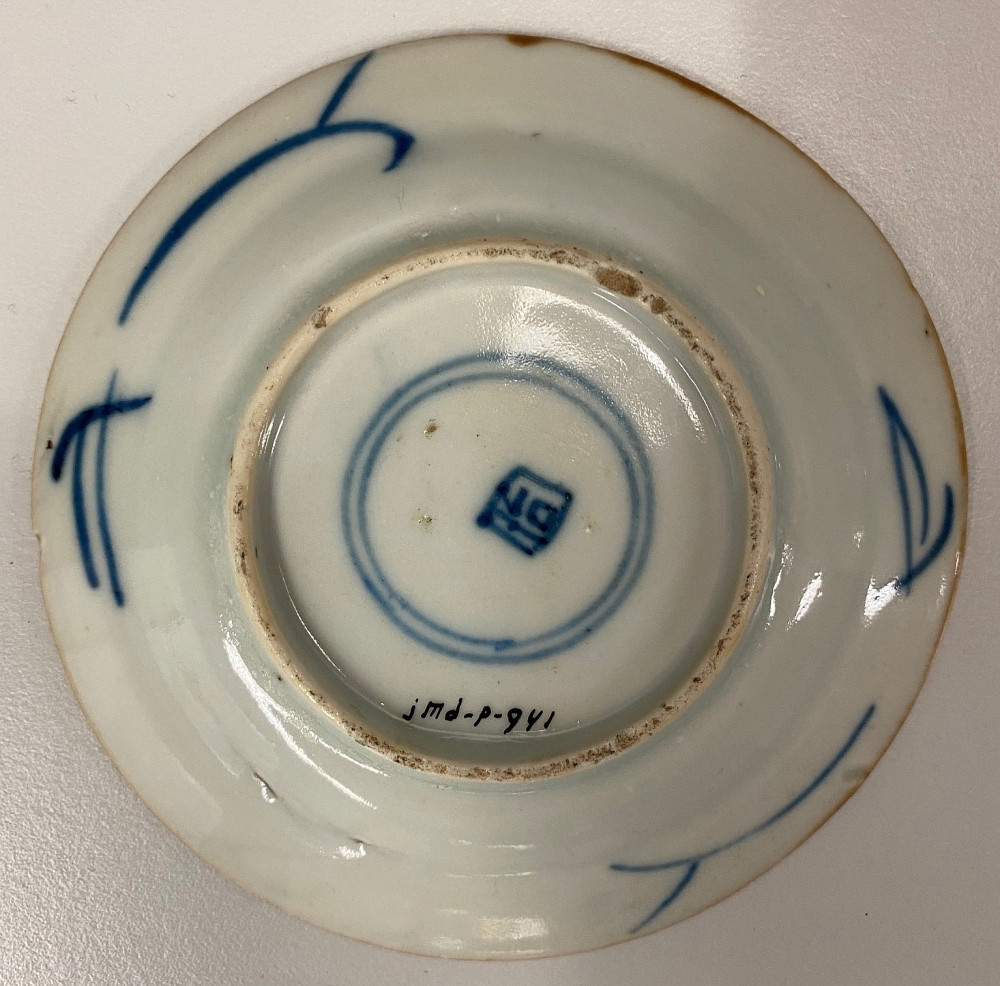 Schoteltje met op lip een bruine lijn. Op de rand een brede blauwe band. Op het plat een blauwe hengselmand.
