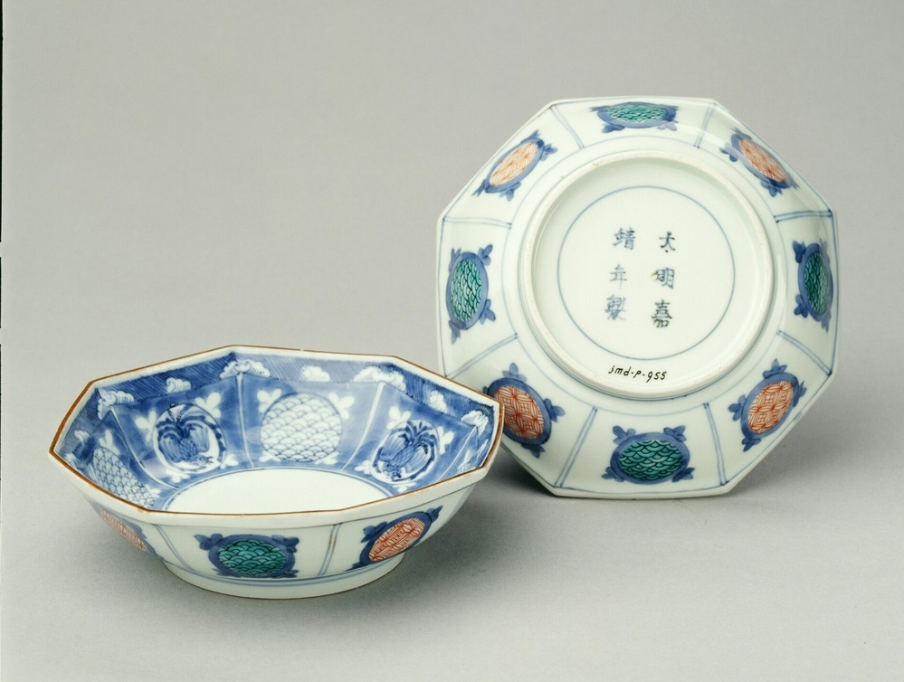 Achthoekige diepe Kakiemon schotel op voetring, opstaande kant. Versierd in onderglazuur blauw, ijzerrood en groen. De acht wandvakken aan de binnenzijde zijn elk versierd met een cirkel op een blauwe grond met daarin om en om een schubmotief en een vliegende phoenix; om de cirkels als hoekvulling een driepas-vormig motief in wit uitgespaard. De rand met evenwijdige schuine strepen en schuimkop-motieven. Het centrum is onversierd. In de wandvakken op de buitenzijde eenzelfde cirkel met driepas-motieven in blauw, om en om gevuld met schubmotieven in groen en cash-motieven in ijzerrood. Onder op de bodem het zes-karakter merk Jiajing in een cirkel. Bruine rand.