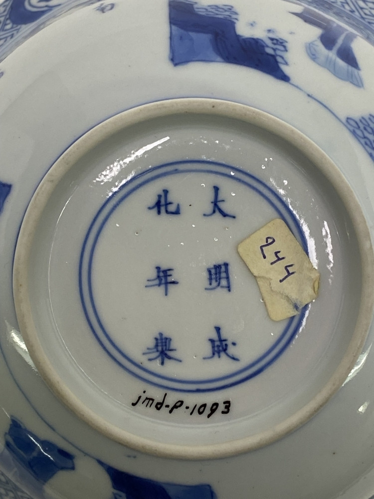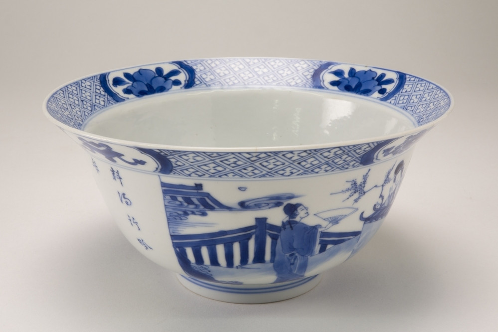 Kom (klapmuts) van porselein met twee panelen met lijzen en daartussen tekst in chinese karakters. De bovenrand is aan de binnen- en buitenzijde gedecoreerd en voorzien van 4 cartouches met bloemen. Op de bodem van de kom drie zotjes. K`ang Hsi