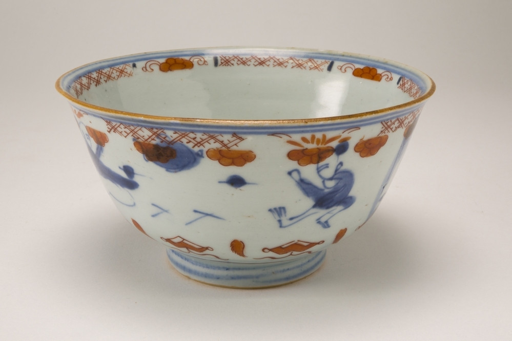 Amsterdams bont kom van porselein op standring gedecoreerd met in onderglazuur blauwe zotjes. Hierover gedecoreerd in ijzerrood met gestyleerde bloemen en lampionnen .