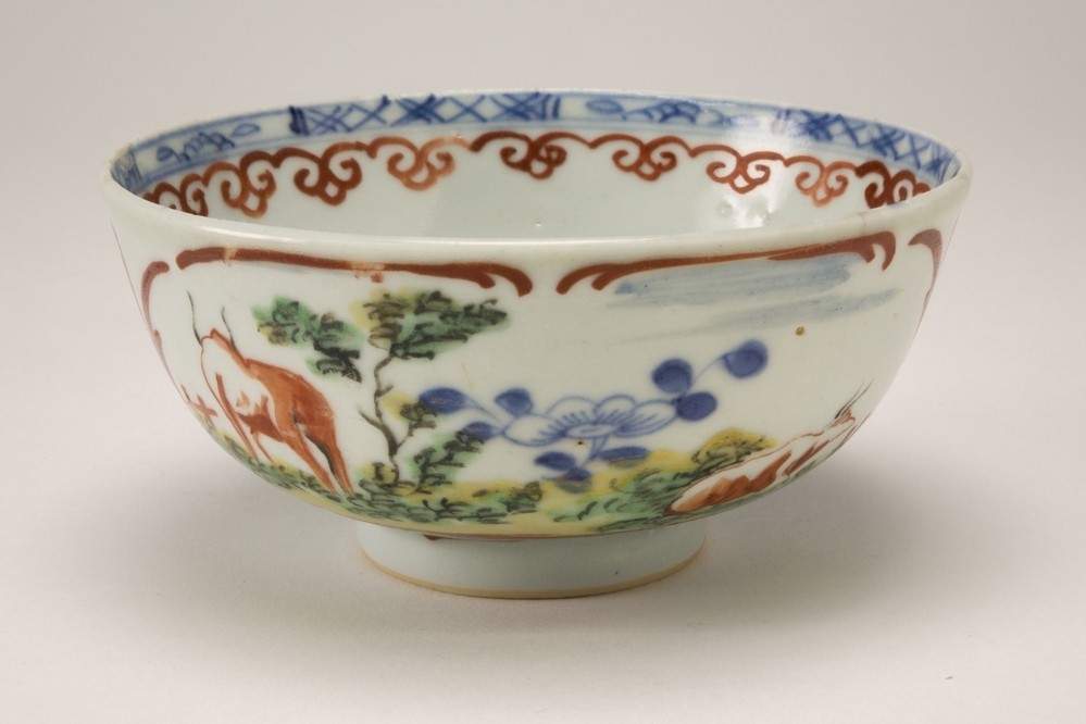 Amsterdams bont kom van porselein met een in onderglazuur blauwe binnenrand en een In emaille over gedecoreerde ijzrrode versieing. Op de buitenzijde enkele Blauwe bloemen en een overdecoratie van twee catouches met daarin een decoratie van twee koeien en een boom in ijzerrood, zwart, geel en groen.