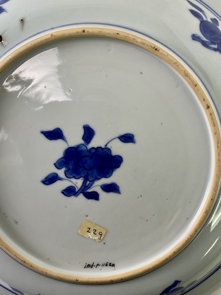 Schotel op voetring, platte rand. Versierd in onderglazuur blauw. Op plat en wand een berglandschap met een rivier, huizen op de oever, rechts een aangemeerde vissersboot. Op de rand drie vruchtdragende takken, waaronder een granaatappel. Op de achterzijde drie perziktakken. Onder op de bodem een bloemtak. In vorm en versiering (vooral ook de achterzijde en onderkant) is deze schotel zeer verwant aan cat. 50{}. Het berglandschap is weergegeven in de stijl van ‘the master of the rocks’, waarbij evenwijdig geschilderde lijnen in de rotspartijen de vorm bepalen en massiefheid suggereren. Deze stijl werd toegepast in de periode van c. 1660–1690, en is uiteraard niet van één ‘meester’ afkomstig (zie ook cat. 52{}). Hier is een pastoraal landschap weergegeven dat appelleerde aan de wens van de Chinese literaat naar rust en contemplatie in de natuur, maar ook aan de Westerse opvatting over China als een onbedorven, paradijselijk land.