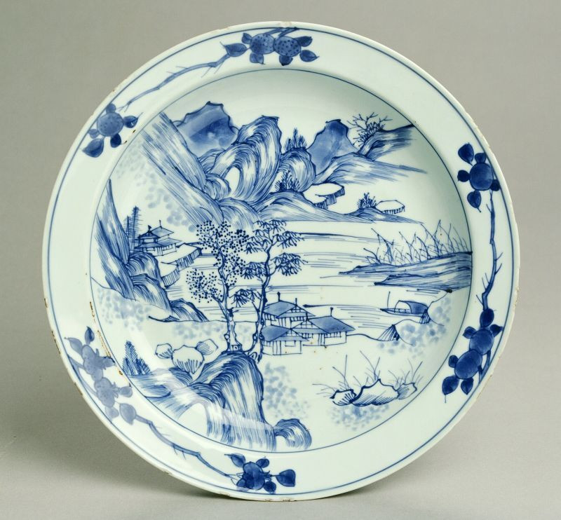 Dish on footring, flat rim. Decorated in underglaze blue. On the centre and sides a landscape with mountains, a river, houses on the riverbank, a moored fishing boat to the right. On the rim three fruit-bearing sprays, one of which is a pomegranate. On the reverse three peach sprays. On the base a flower spray. The shape and decoration, especially on the reverse and base, strongly link this piece to the dish, cat. 50. The mountainous landscape is portrayed in the style of the ‘the master of the rocks’, where the painted parallel lines depicting the rocks suggest their shape and density. This style was popular c. 1660–1690 and was definitely not derived from the work of a single master. (see also cat. 52{}). The kind of pastoral landscape depicted here appealed not only to the sensibilities of Chinese literati who idealised rest and contemplation in nature, but also to the Western notion of China as an unspoiled paradisical land.