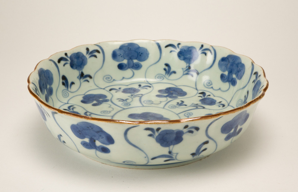 Blauw witte schaal met gelobte golvende rand met op de lip een bruine lijn.Op de binnen- en buitenzijde blauwe bloemdecoraties.