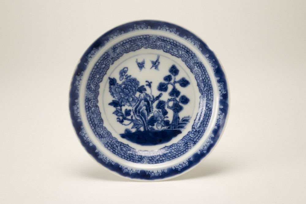 Blauw wit schoteltje met op het plat blauwe bloemen, een boompje en twee vliegende vogels.
