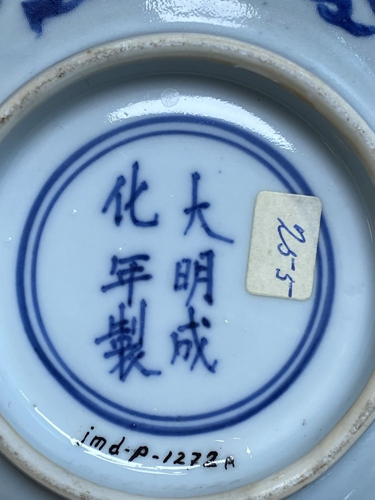 Grijswitte kom op standring met naar buiten gebogen lip. op de binnen- en buitenzijde blauwe bloem- en drakendecors.