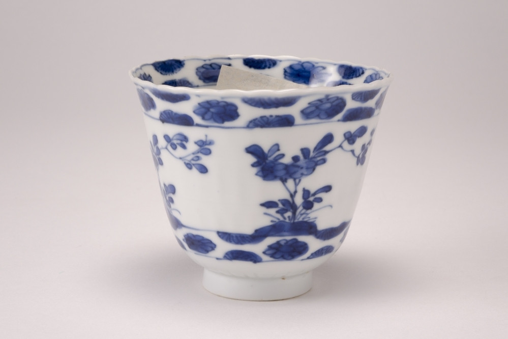 Witte gelobde kop met gegolfde bovenrand. Op de binnen- en buitenzijde een blauw bloemen- en rankendecor. K`ang Hsi