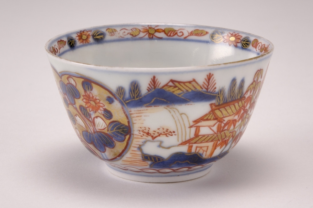 Imari kopje gedecoreerd met een landschap en bloemen in goud, blauw, ijzerrood en oranje.