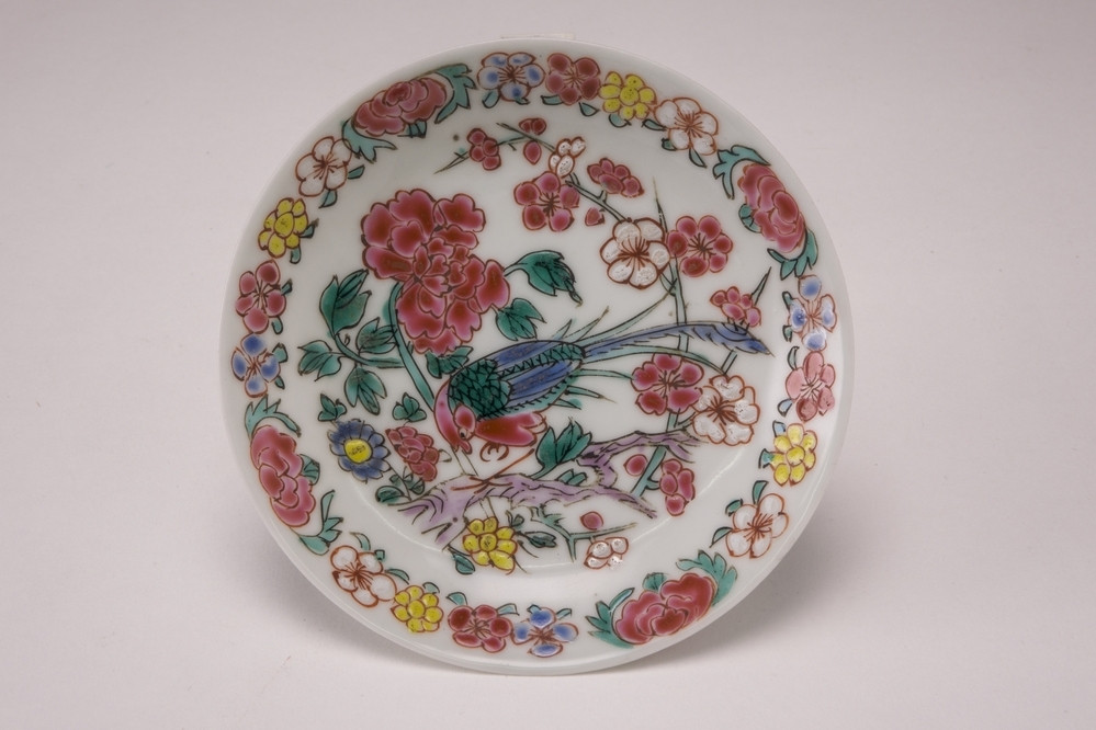 Famille rose schoteltje met meerkleurige bloementakken en een fazant. Yung-cheng.