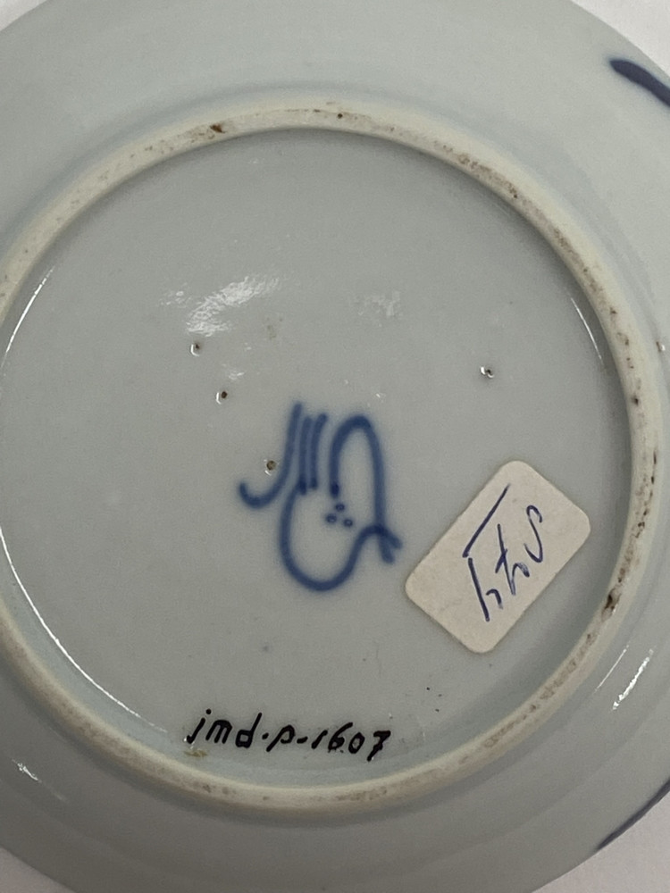 Wit schoteltje met blauw landschapdecor met diverse personen.