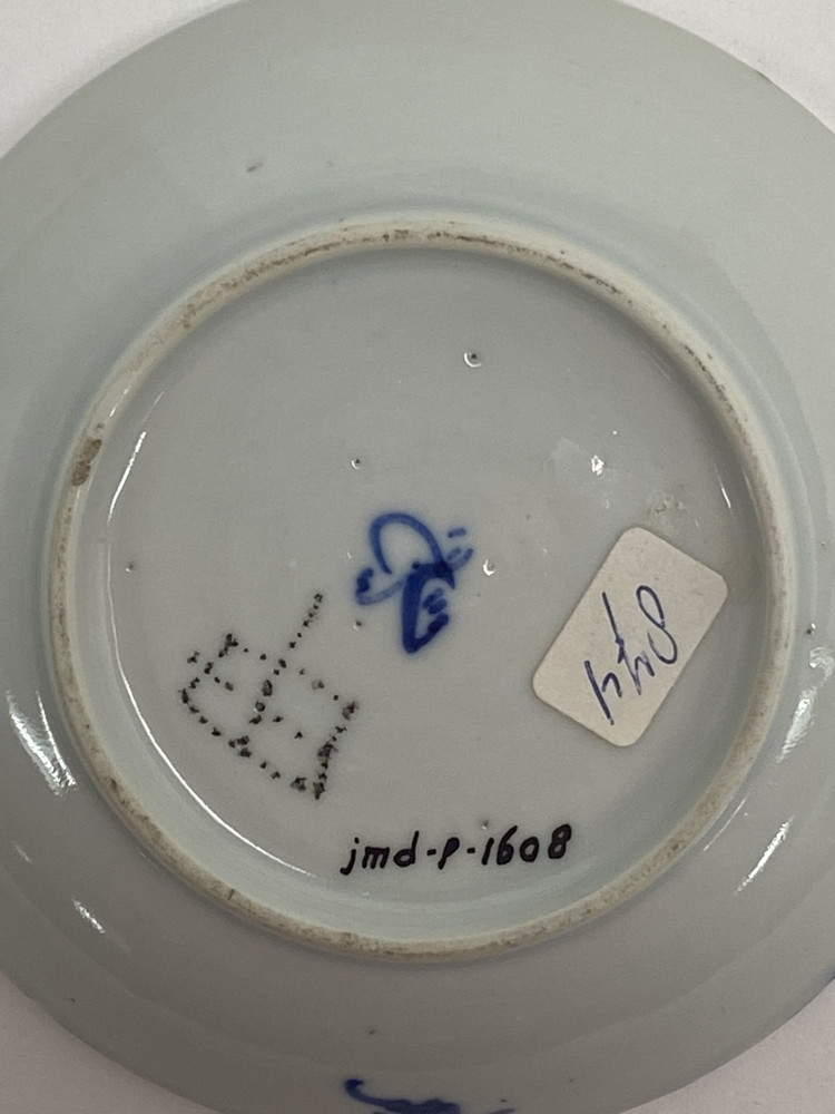 Wit schoteltje met blauw landschapdecor met diverse personen.