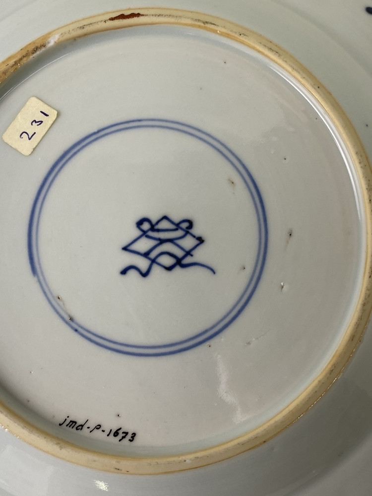 Blauw gedecoreerd plat wit bord met op de rand acht vlakken waarvan vier met bloemdecors en vier met kruisvlakjes. Op het plat een decoratie met planten, vogels en bijen.