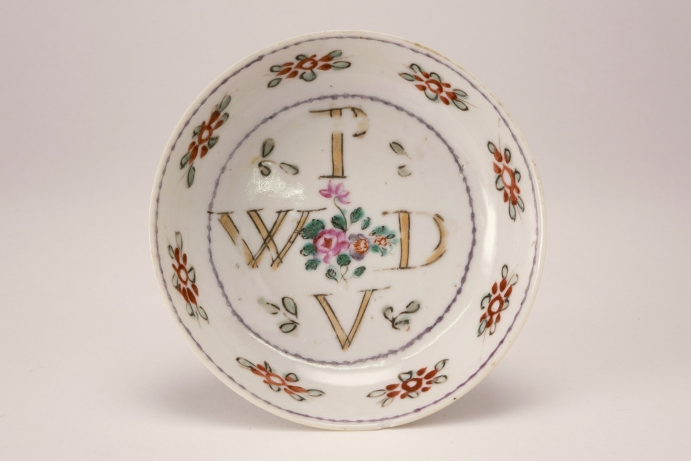 Chinees schoteltje met op het plat vier letters in goud met hieromheen acht bloemetjes in rood en groen.
