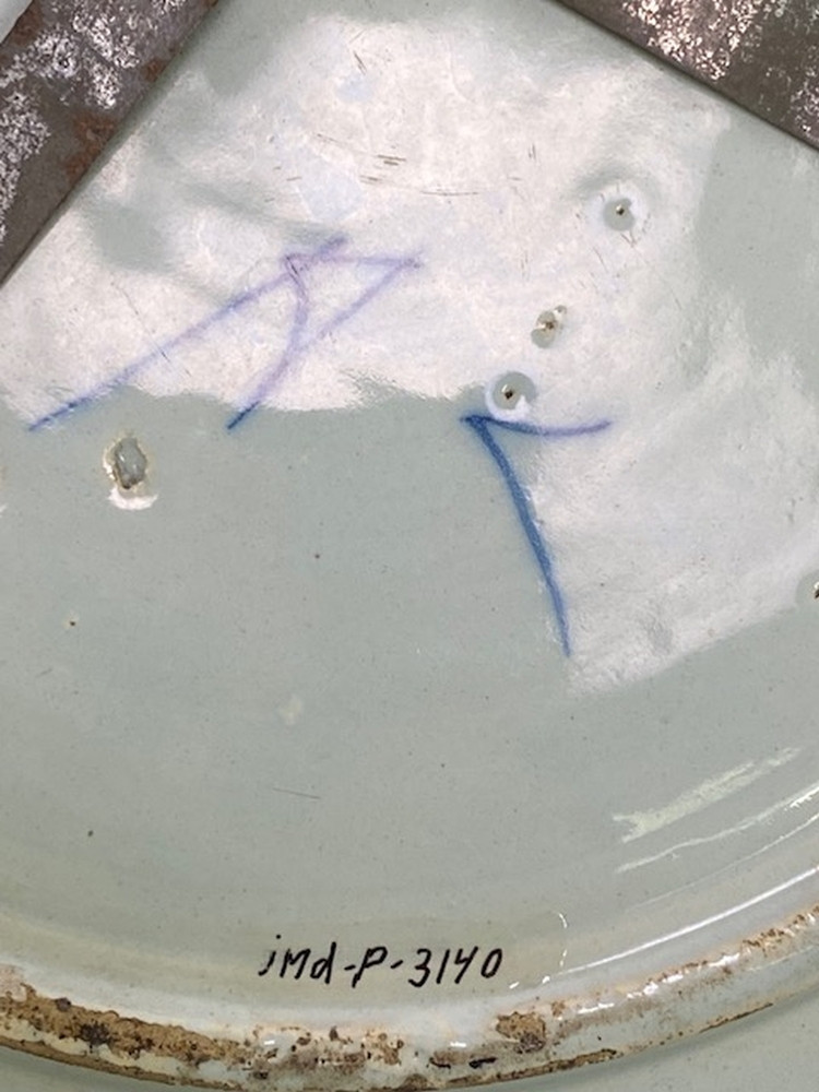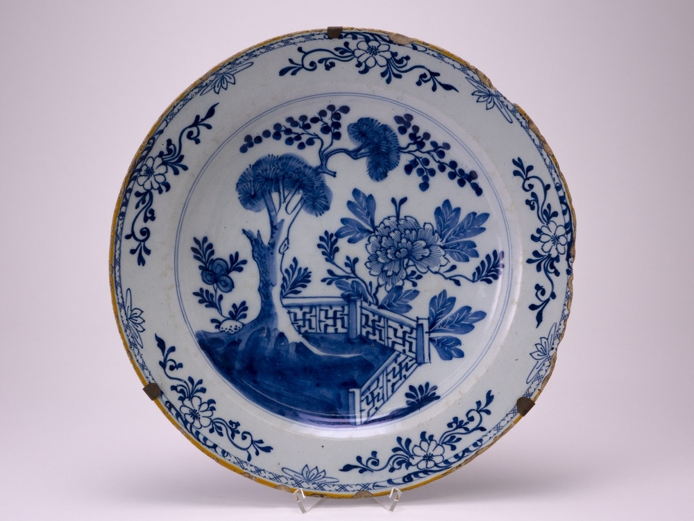 Delftse blauw gedecoreerde aardewerk schotel met okergele lijn op de rand, Chinoiserie decor van bloemen bij hek. Gemerkt; De Porceleyne Bijl, Delft.