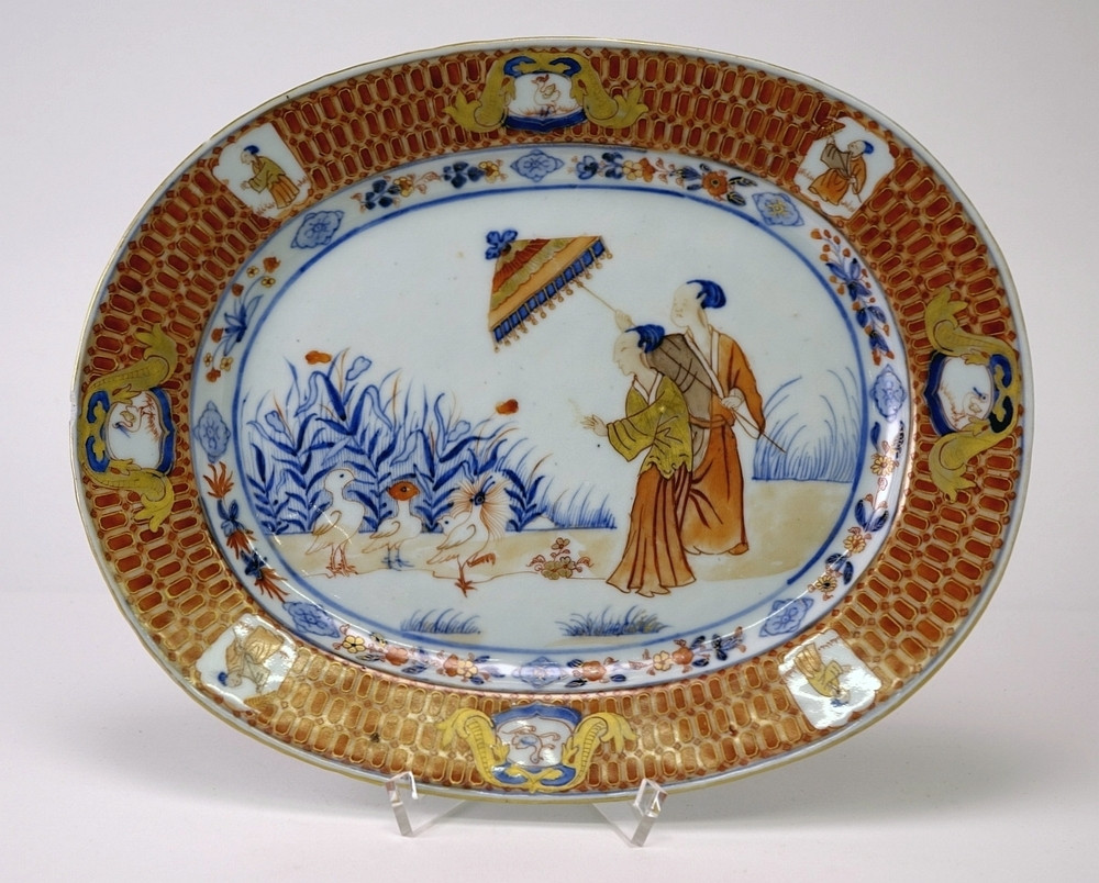 Terrine met onderschotel. De tekening op de schotel is opgebouwd uit een ovaal beeldvlak, omsloten door twee ringen. In het centrum buigt een vrouw aan de waterrand met rietstengels zich wat naar voren om een drie vogels te bekijken. Een tweede vrouw beschermt haar met een parasol tegen de zon. Binnen de aangrenzende ring bevinden zich acht grote bloemen, met elkaar verbonden door kleinere bloemen. In de buitenste ring keren onderdelen van het centrale beeldvlak terug: wisselend een vrouwenfiguur en een exotische vogel. De ruimten tussen de figuren is opgevuld met een geometrisch motief. Een ontwerp van Cornelis Pronk (1691-1759) in opdracht van de Verenigde Oost-Indische Compagnie. Lang ná de dood van Cornelis Pronk was het ontwerp nog steeds populair; buiten de VOC om hebben Nederlandse handelaars het ontwerp ook in Japan laten uitvoeren.