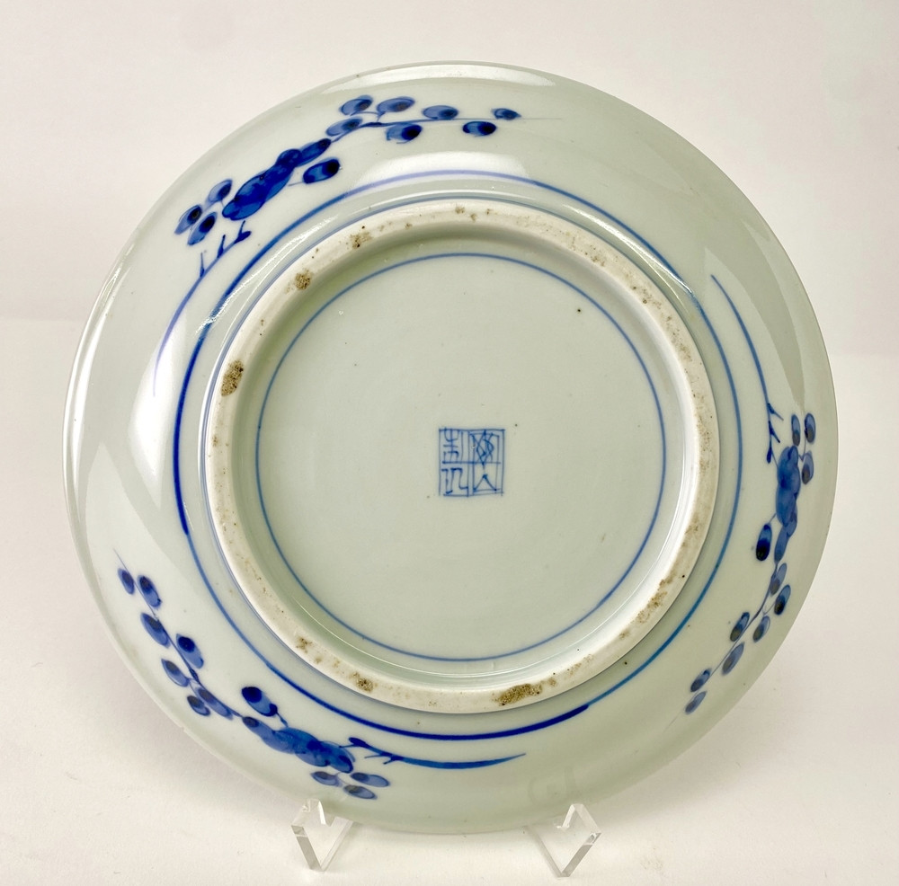 Schotel op voetring, vlakke naar buiten buigende rand. Zwaar gepot. Over het hele oppervlak gedecoreerd in onderglazuur blauw. Afgebeeld is een berglandschap met drihoekige bergen. Op de voorgrond een denneboom naast beekje met een bruggetje. Achter de boom zijn een paar pagodevormige huizen zichtbaar. De achterzijde is versierd met drie prunustakken. Op de basis is een Hallmark aangebracht. Deze schotel is kenmerkend voor een gevarieerde, maar nog slecht bestudeerde groep Nagasaki Japans export porselein dat in heel Zuid-oost Azië wordt aangetroffen. Het zijn grotendeels schotels met een vereenvoudigde voorstelling van onder andere landschappen, vogels, vissen en geometrische motieven.