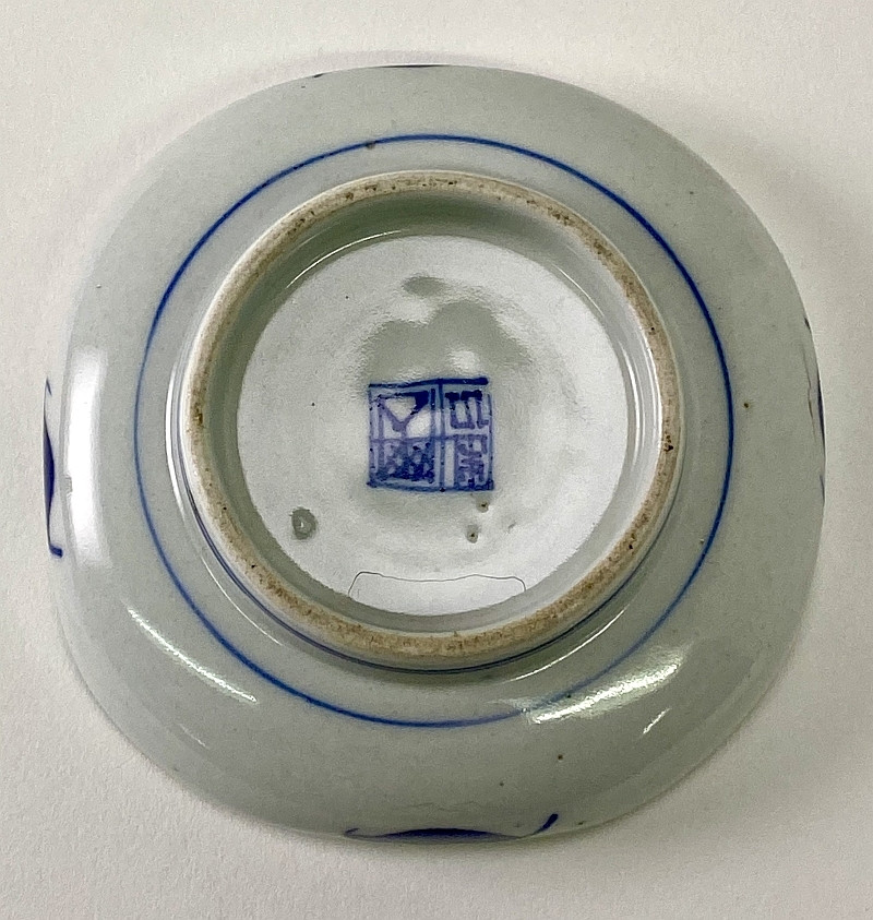 Japans Imari grijswit vierhoekig schaaltje op voetring met vlakke opstaande bruine rand. Langs de binnenrand een Griekse randversiering in onderglazuur blauw. Op het plat ook in onderglazuur blauw twee vissen met daarachter waterplanten. Op de buitenzijde in blauw vier gestileerde vleermuizen. De onderzijde is een hallmark aangebracht.