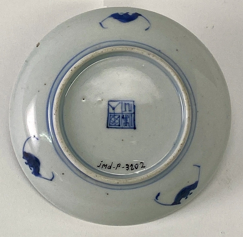 Japans Imari grijswit schoteltje op voetring met vlakke opstaande rand. Langs de binnenrand een Griekse randversiering in onderglazuur blauw. Op het plat ook in onderglazuur blauw een prunus- en pioentak met daar omheen twee vlinders. Op de buitenzijde in blauw drie gestileerde vleermuizen. De onderzijde is een hallmark aangebracht.
