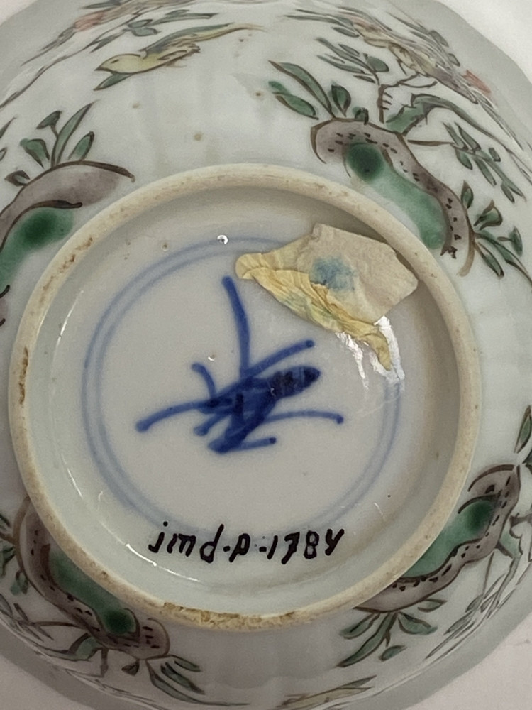Wit gelobd kommetje met blauwe rand en op de buitenzijde fijne famille verte decoraties met bloemen vogels en vlinders.