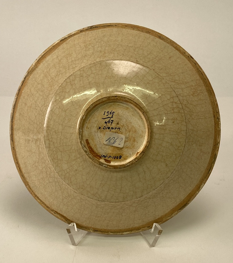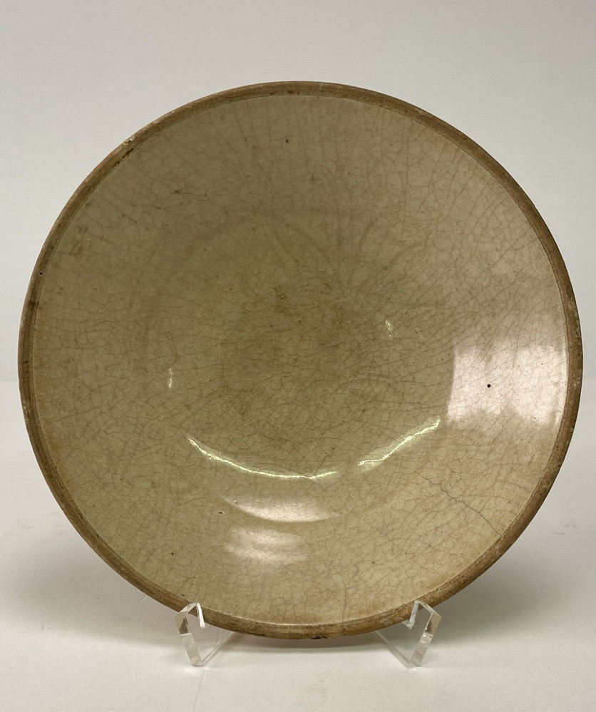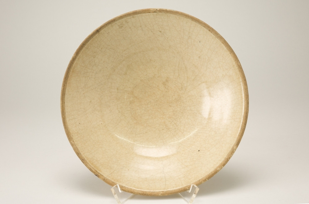 Kom van Siamees steengoed. Crêmekleurige, gecraqueleerde kom met ongeglazuurde bovenrand. Onder het glazuur een ingegrifte lotusbloemtak. De messing ring ontbreekt. (Song)