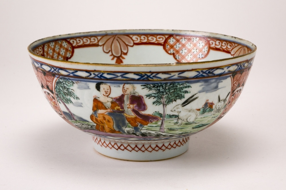 Amsterdams bont kom op standring. Op de bodem diverse bloemen in een blauw met ijzerrode zigzagrand. Langs de binnenrand een ijzerrode guirlandeversiering aan een blauwe band. Op de buitenzijde 2 witte uitsparingen met hierin een zittend Europees paar en twee konijnen (?). Afgewisseld met 2 cirkels met Europese landschapjes.