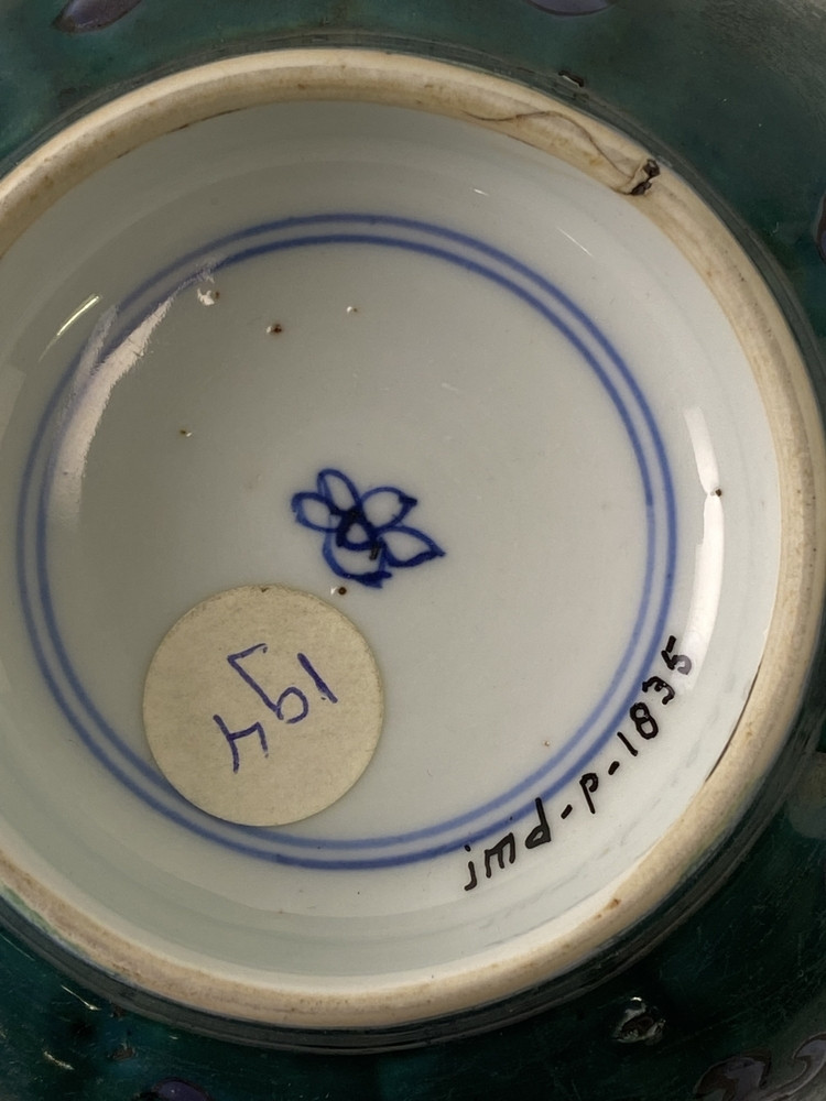 Geplooide kom op standring met een witte binnenzijde. Op de bodem een vlammende parel in ijzerrood, groen en paars. Aan de buitenzijde rondom twee paarse draken en vlammende parels op een donkergroene ondergrond. K`ang Hsi
