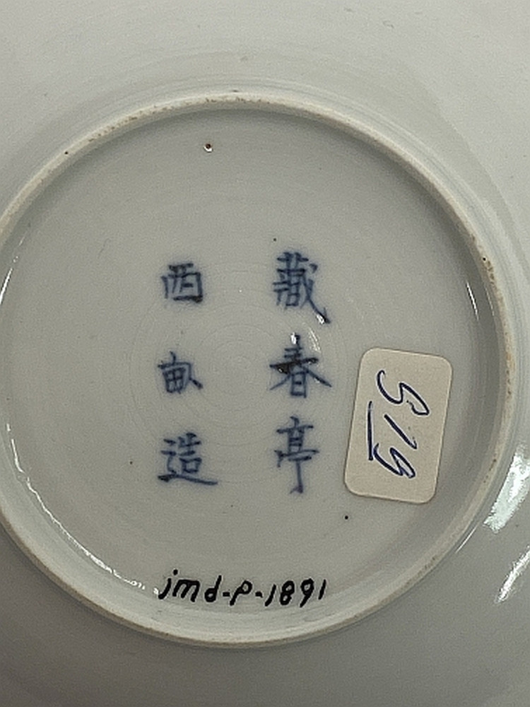 Wit eierschaal schoteltje met op het plat, in blauw, 1 krijger, een zittende vrouw en twee vlakken met tekst. Edo periode