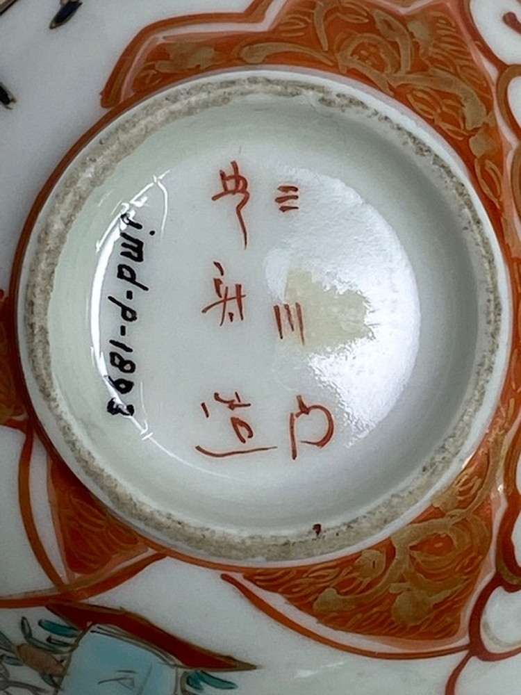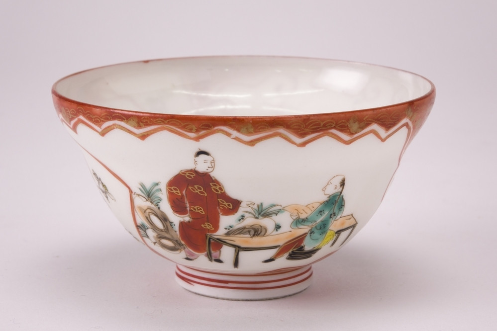 Wit eierschaal kopje met op de buitenzijde drie cartouches met daarin een vaas met takken, twee personen aan een tafen en 1 persoon met waaier in meerdere kleuren.
