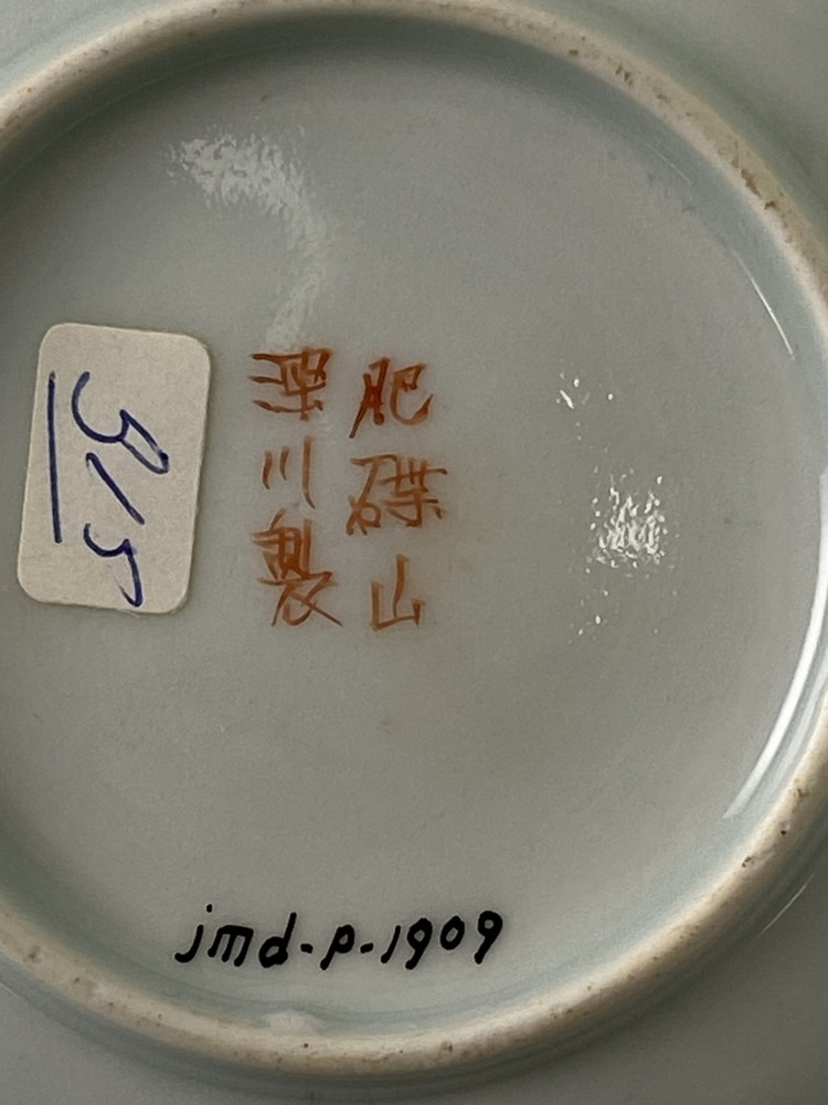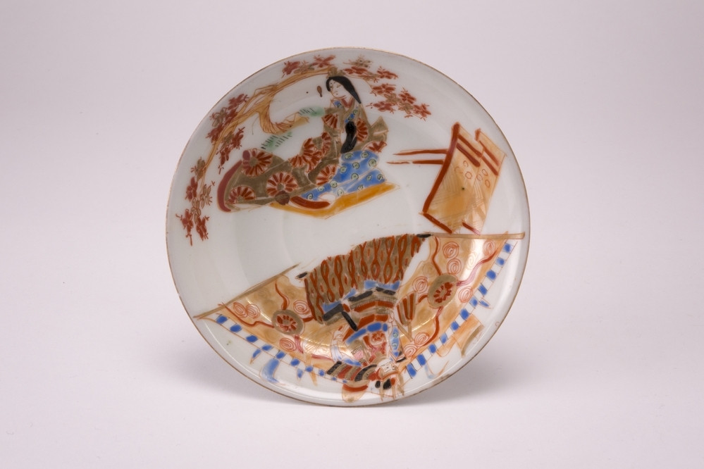 Wit schoteltje met ijzerrode rand en op het plat drie cartouches met daarin een landschapje met bloemen en vogel, drie personen aan een tafel en in de laatste 1 zittende persoon en twee staande personen in meerdere kleuren. Meiji, 19e eeuw.
