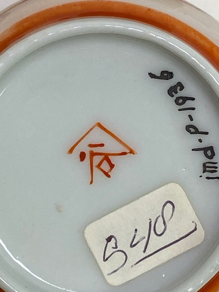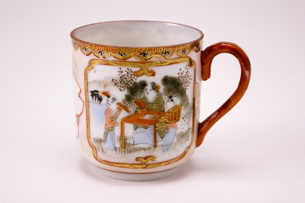 Wit kopje met oor en ijzerrode rand. Op de buitenzijde drie cartouches met daarin een landschapje met bloemen en vogel, drie personen aan een tafel en in de laatste 1 zittende persoon en twee staande personen in meerdere kleuren.