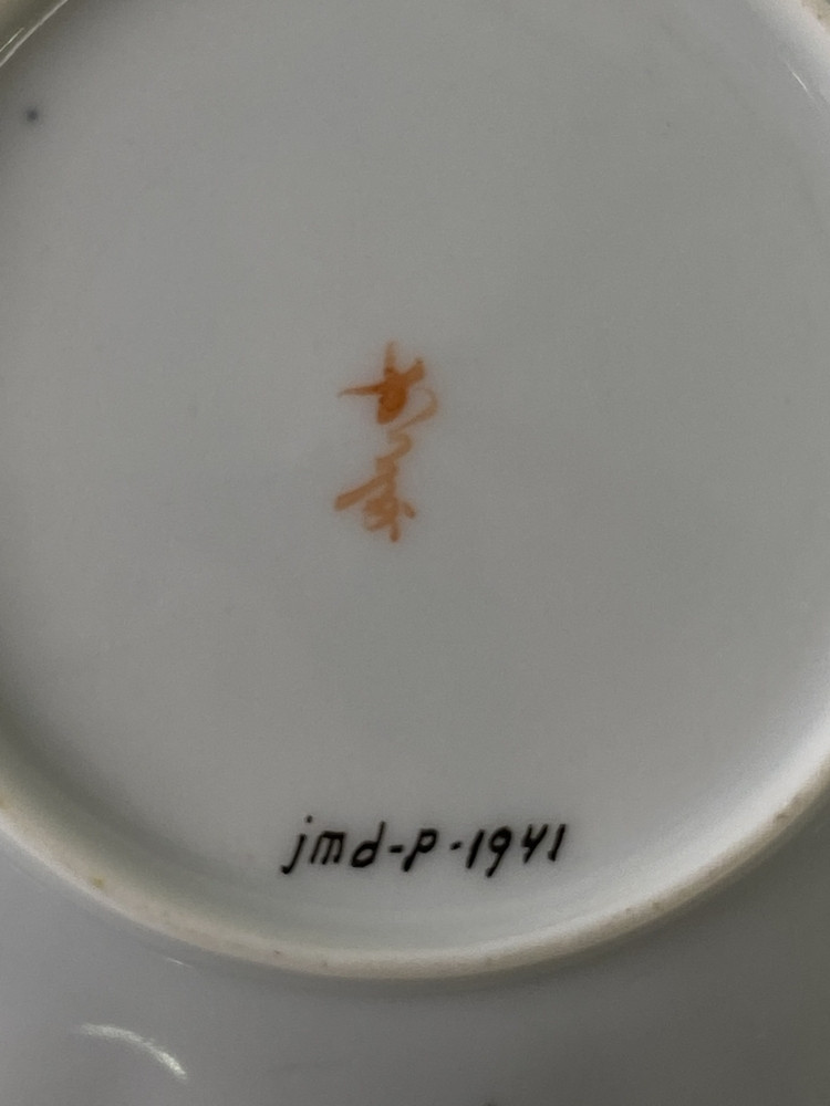 Wit schoteltje met geschulpte rand. Langs de rand een versiering in zwart,ijzerrood en goud. Op het plat een landschapdecor met bergen, huizen en twee personen, in zachte tinten.