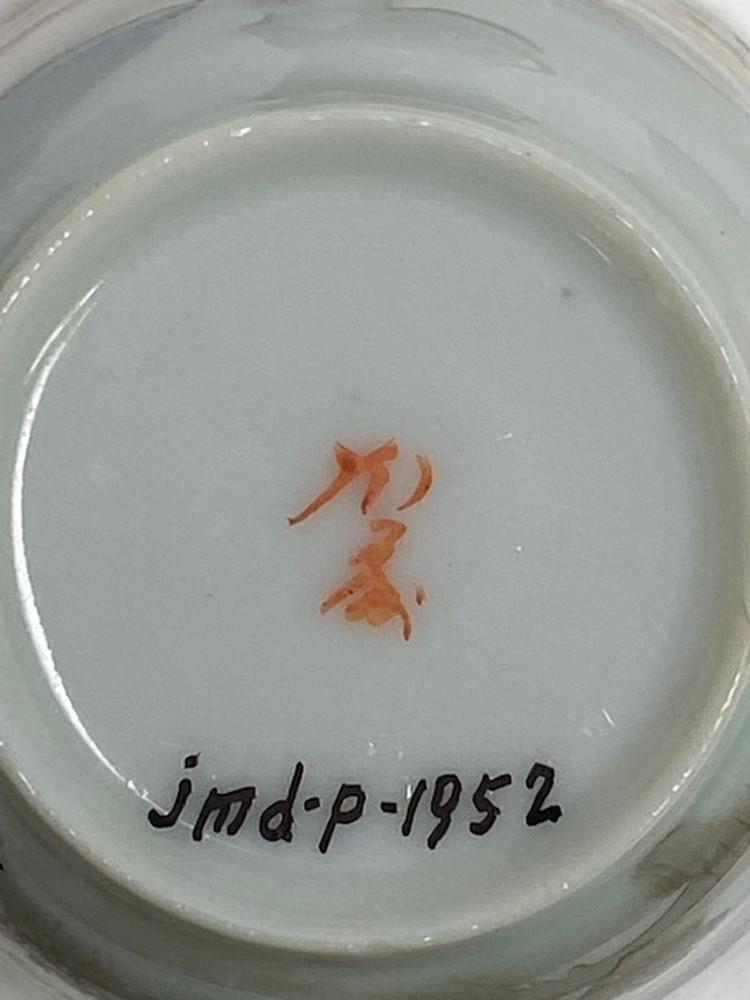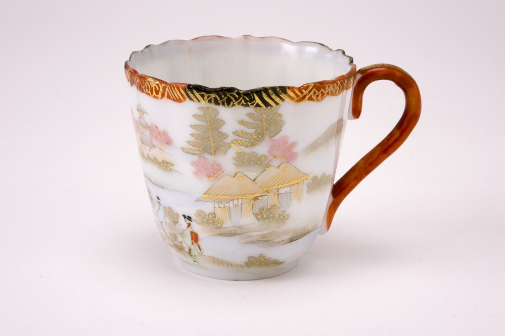 Wit kopje met oor en geschulpte rand. Langs de rand een versiering in zwart,ijzerrood en goud. Op de buitenzijde een landschapdecor met bergen, huizen en twee personen, in zachte tinten.