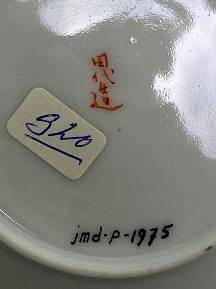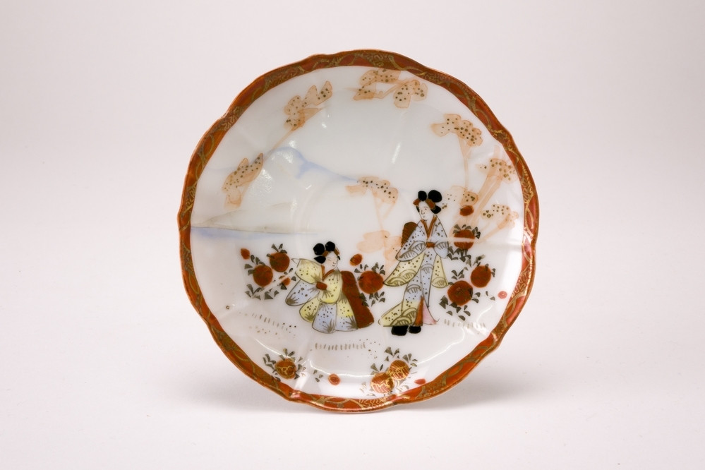 Wit Satsuma schoteltje met gegolfde rand. Langs de rand een versiering in ijzerrood en goud. Op het plat een landschapdecor met bergen en twee personen, in zachte tinten.