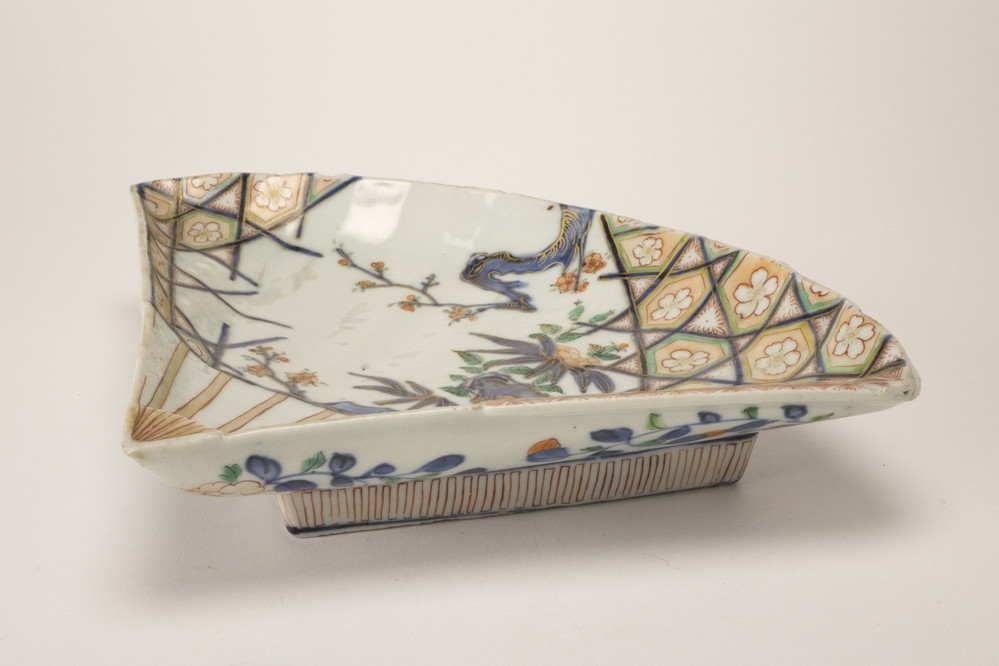 Fan-shaped dish on a high, triangular foot. Lobbed edge. Imari, painted in underglaze blue, green iron-red and gold, the decoration fitting the shape. In the middle a prunus tree, bamboo and a flowering shrub, on the sides latticework, the polygonal openings filled with cherry blossoms. On the reverse peony sprays, the foot with a comb pattern. The lower point with the spreading ends of the fan-sticks has broken of.
