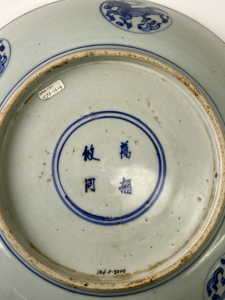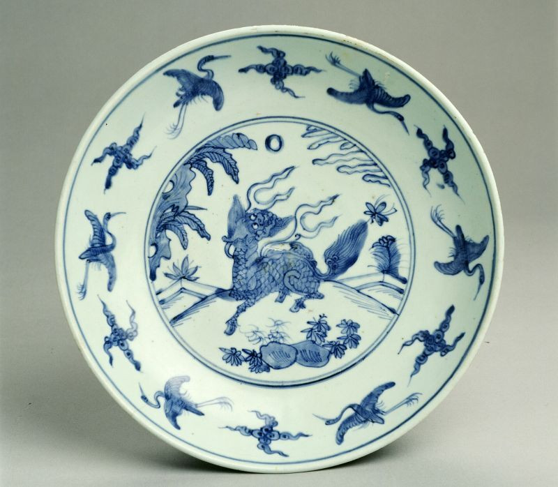 Dish on footring, spreading sides. Decorated in underglaze blue. In the centre a kylin in a landscape, on the sides twelve flying cranes. On the outside six circles containing a galloping horse and a flame motif. On the base the four-character mark wan fu you tong (infinite luck be with you). Kylins are mythical animals with a scaly body, a horn, a bushy tail, a mane and cloven hooves. They bring good luck and many offspring, and are the guardians of all hairy creatures. The crane is a symbol of longevity and wisdom. Good wishes abound on this dish and are emphasised by the mark on the base.