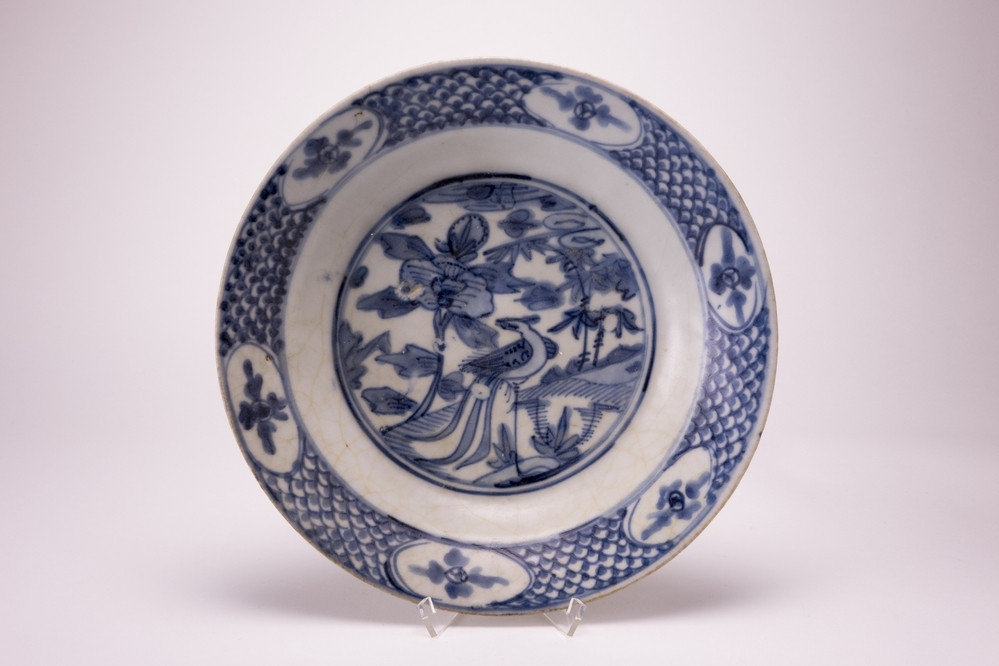 Grijs witte diepe schotel met op het plat een blauw landschapdecor met bloemen en een vogel. Op de rand een blauw schub-decor met daarin zes uitsparingen met bloemen.