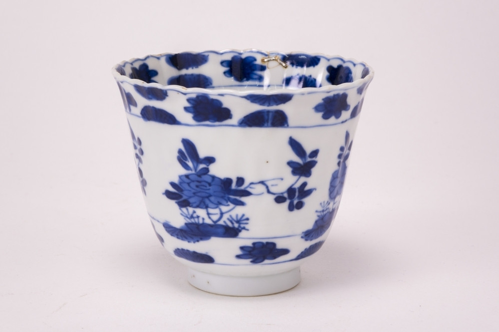 Witte gelobde kop met gegolfde bovenrand. Op de binnen- en buitenzijde een blauw bloemen- en rankendecor. K`ang Hsi
