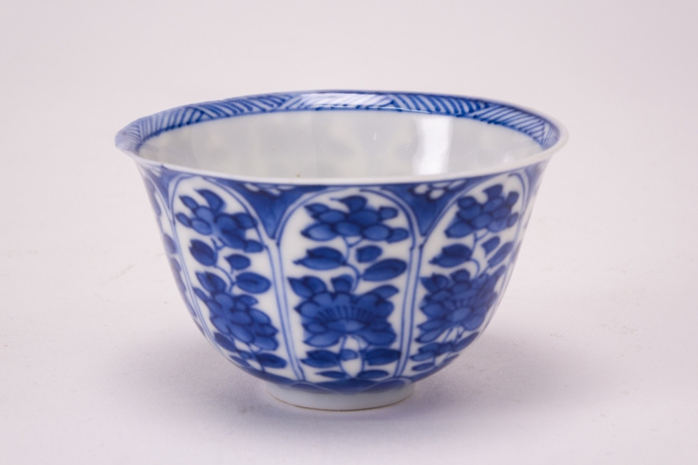 Wit kommetje met op de buitenzijde blauwe bloemdecoraties.