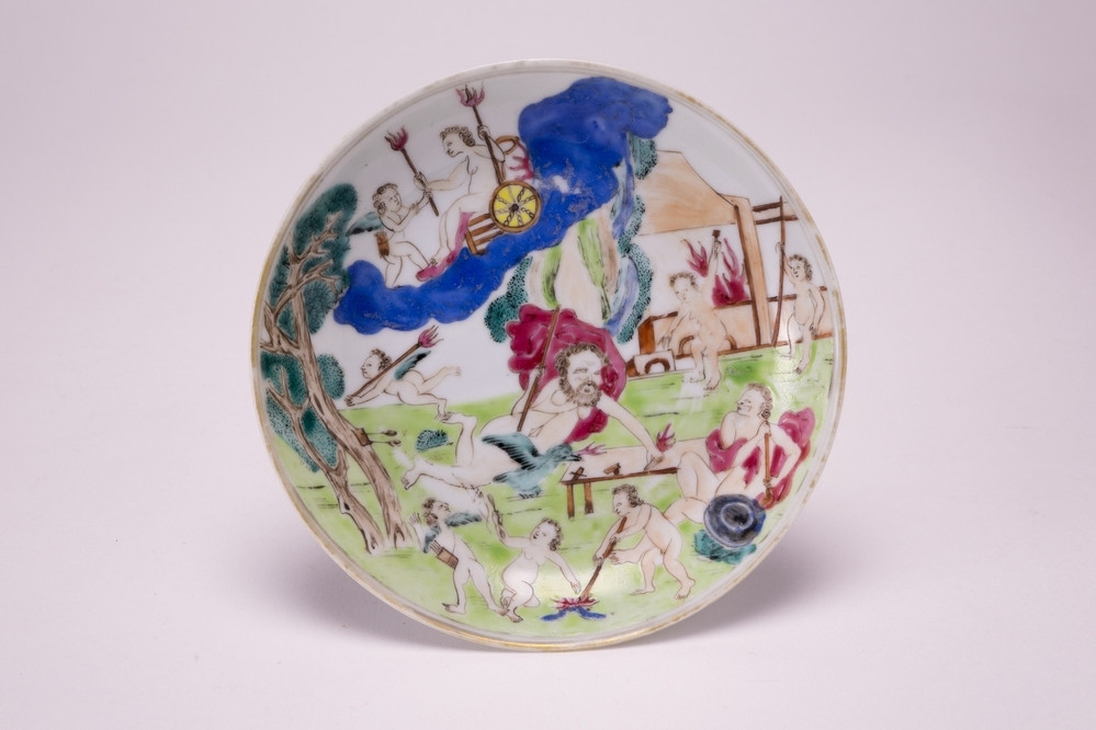 Schoteltje op een voetring. Gedecoreerd in emailkleuren en goud met een allegorische voorstelling van het element Vuur. In het midden van de voorstelling is Jupiter te zien, god van het licht en de (stralende) hemel en alle natuurverschijnselen. Rechts afgebeeld is Vulcanus, god van het vuur en het smidswerk. In de wolken in een wagen zit Venus, de godin van de liefde. Rondom verschillende Amors, zij symboliseren de kracht die staal en diamant kunnen doorboren, en zelfs de harten van de goden. De voorstelling is bijzonder amateuristisch geschilderd.De prent die als voorbeeld diende werd gemaakt door Antoine Herisset (1685-1769) naar een schilderij van Francesco Albani (1578-1669). De voorstelling is uit een serie van vier, de andere elementen zijn Water, Lucht en Aarde. Alle elementen zijn uitgebeeld door dezelfde kunstenaars, op schilderij en op prent. Al deze voorstellingen komen voor op porselein.