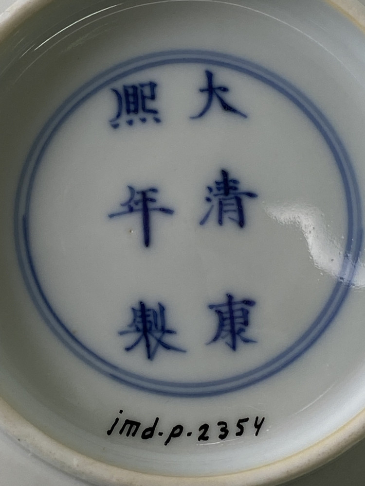 White bowl with spreading rim, with green, purple and yellow floral decorations with two butterflies on the outside. (décor Tao Kwang) Below the decoration decorated with inscribed five-clawed dragons, cloud motifs and flaming pearls under the glaze. Marked on underside.