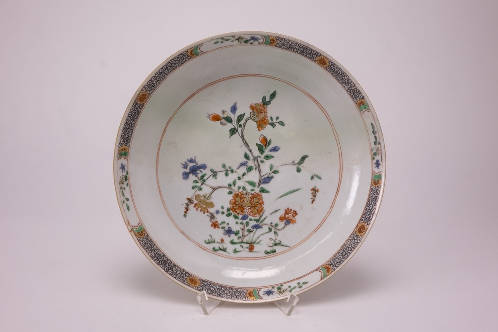 Wit rond bord met op het plat een famille verte decor. Hier omheen een dubbele ijzerrode lijn. Op de rand een een smalle band met vier uitsparingen met een famille verte bloemdecor. Op de lip een lichtbruine lijn. De achterzijde is lichtbruin.