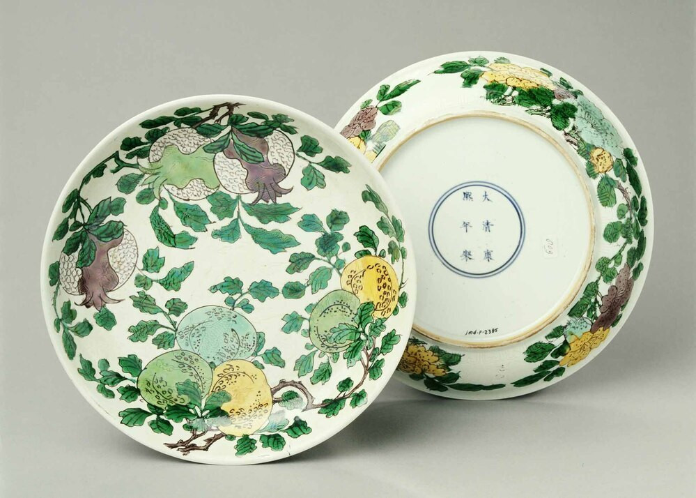 Schotel op voetring, spreidende wand. Twee schotels op voetring, spreidende wand. Famille verte, versierd in emailkleuren op het biscuit met vruchtdragende perzik- en granaatappeltakken, bedekt met een transparante loodglazuur. Omtrekken en details zijn in zwart geschilderd. Onder het glazuur is in het biscuit een decoratie ingegrift van twee draken die tussen wolkmotieven een vlammende parel najagen. Op de buitenkant twee langgerekte bloemtakken en eenzelfde ingegrifte versiering. Onder op de wit geglazuurde bodem het zes-karakter merk Kangxi in een dubbele cirkel. Dergelijke ingegrifte, op en in het biscuit (gebakken maar niet geglazuurd porselein) versierde schotels behoren tot de fraaiste stukken in dit genre dat voor het Keizerlijk hof geproduceerd werd. Keizerlijk Kangxi porselein (identificatie Hu Zhaohui, National Museum of China en Christiaan Jörg), voor eigen gebruik aan het hof. Vergelijkbare exemplaren bevinden zich in het Nationaal Museum in Taiwan, in het Shanghai Museum en elders. Er bestaan latere nabootsingen, eveneens Kangxi gemerkt. De vlotheid van de beschildering, de trefzekere gravering en de zachte, creme kleur van het biscuit van deze twee schotels re...