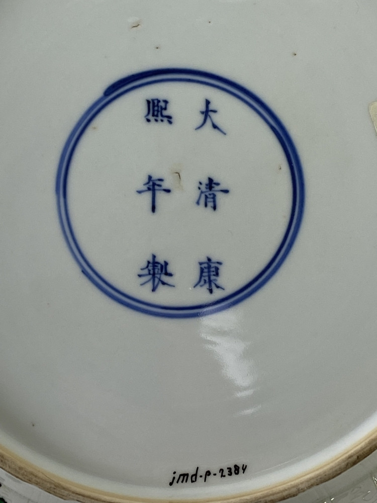 Dish on foot ring, spreading wall. Two dishes on foot ring, spreading wall. Famille verte, decorated in enamel colors on the bisque with fruit-bearing peach and pomegranate branches, covered with a transparent lead glaze. Outlines and details are painted in black. Beneath the glaze a decoration of two dragons chasing a flaming pearl between cloud motifs is inscribed in the cookie. On the exterior two elongated flower branches and the same inscribed decoration. Below on the white glazed bottom the six-character Kangxi mark in a double circle. Such incised, on and in cookie (fired but unglazed porcelain) decorated dishes are among the finest pieces in this genre produced for the Imperial court. Imperial Kangxi porcelain (identification Hu Zhaohui, National Museum of China and Christiaan Jörg), for the court's own use. Similar specimens are in the National Museum in Taiwan, in the Shanghai Museum and elsewhere. Later imitations exist, also Kangxi marked. However, the smoothness of the painting, the accurate engraving and the soft, cream color of the bisque of these two dishes warrants a dating in the Kangxi period. Below on the white glazed bottom the six-character Kangxi mark ...