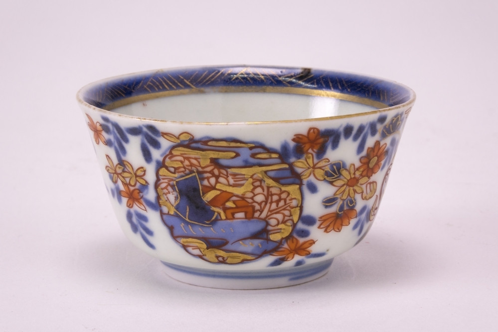 Imari kopje met op de buitenkant een vaas met takken en links en rechts een gouden cirkel.