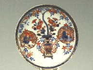 Imari schoteltje met op het plat een vaas met takken en links en rechts een gouden cirkel.