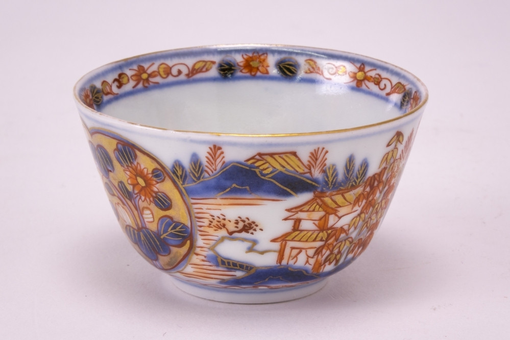 Imari kopje gedecoreerd in goud, blauw, ijzerrood en oranje.